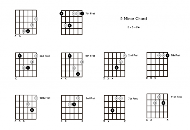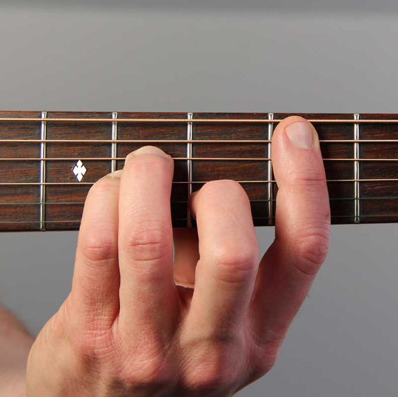 • Barre all strings from the A string (5th string) down to the high E string (1st string) at the 2nd fret.